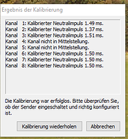okay ich habe jetzt in der Software > Fernsteuerung > Mutliplex Standard verwenden ausgewählt und jetzt habe ich den Fehler von Kanal 4 weg. Der von Kanal 5 ist aber noch immer da. Das ist der Zusatzkanal bei der Motortrimmung. Der lässt sich aber nur auf -100% oder +100% einstellen. 0 gibt es da nicht.....