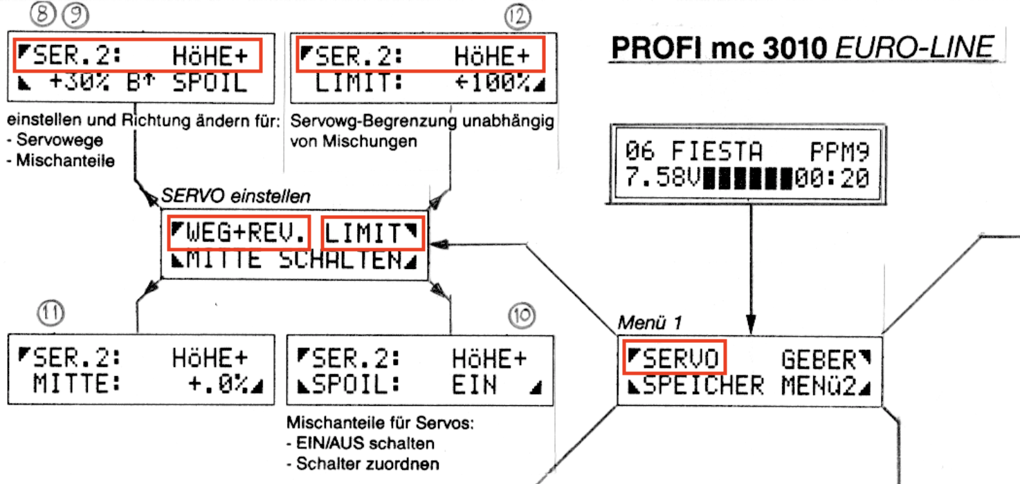Wie beim Gebereinstellungen: Servo "SPOILER" wählen, Knuppel nach oben schieben, Pfeil zeigt nach oben, "WEG" drücken, % Wert wie gewünscht einstellen, z.b. 100%.